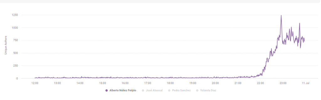 Alberto Núñez Feijóo fue el que obtuvo más menciones, alcanzando más de 137K. El pico de menciones se produjo a las 10:54pm, cuando destacan temas como el ambiente del debate, el estilo de Feijóo para debatir y las afirmaciones de Feijóo sobre el estado de la economía.
