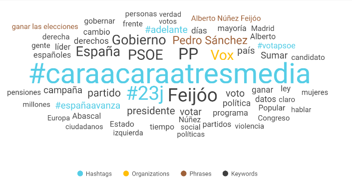 Pedro Sánchez y Alberto Núñez Feijóo se erigen como los protagonistas del debate. Era de esperar, ya que son las dos caras visibles en el debate televisivo. Sin embargo, hubo otros candidatos como Santiago Abascal, de VOX, y Yolanda Díaz, de SUMAR, que si bien no participaron en el debate también se colaron en la conversación online.