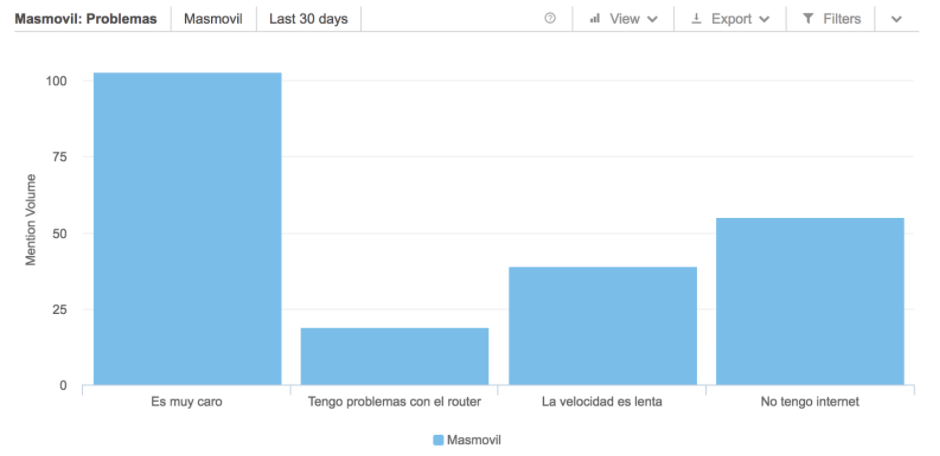 Usaremos a MasMovil como ejemplo para ilustrar cuáles son las quejas más comunes que su audiencia comparte en Twitter. He creado una categoría llamada “Problemas” y después añadí cuatro subcategorías: ‘Es muy caro’, ‘Tengo problemas con el router’, ‘La velocidad es lenta’ y ‘No tengo internet’. Encontrar cuáles son los problemas más comunes te permite identificar oportunidades de mejorar y satisfacer a tus clientes.