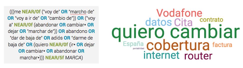 Para identificar a los clientes en riesgo, aquí hay un ejemplo de una Query que puedes adaptar a tu propia marca. Ésta incluye frases clave que los clientes usan cuando hablan sobre el deseo de cambiar de compañía.