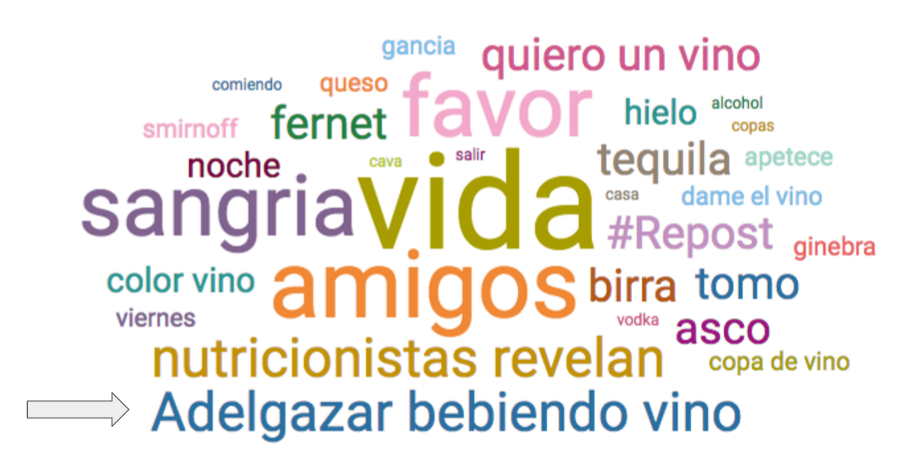 Para empezar, puedes analizar las tendencias y entender el contexto de las conversaciones. En este ejemplo nos centramos en aquellas que mencionan beber vino. Notamos que beber vino se asocia con otros tipos de alcohol y con amigos y fiesta. Pero la conversación más sorprendente es aquella que habla sobre beber vino como una manera de adelgazar.