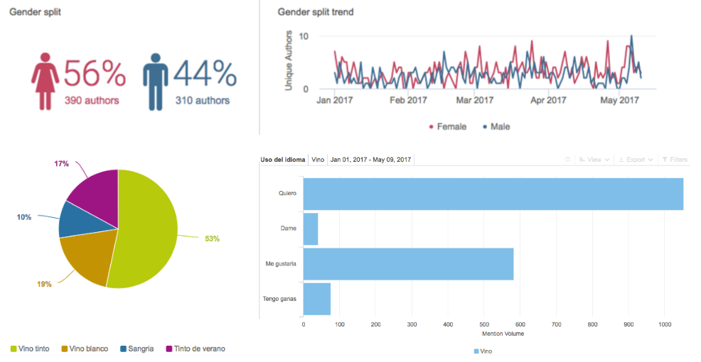 Notamos que la conversación está dominada por mujeres, lo cual sugiere que vale la pena dirigir el mensaje hacia ellas o tenerlas en cuenta cuando se lance una nueva marca de vino.