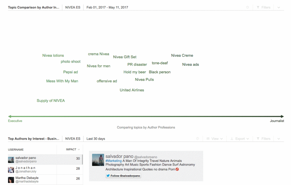 Lo primero que notamos es que los seguidores activos de Nivea en Twitter son sobre todo artistas, estudiantes y ejecutivos y los principales intereses son música, familia y deportes. Esta debe ser información clave a tener en cuenta cuando se haga marketing para estos segmentos.