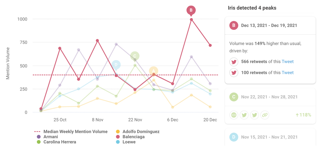 Rápidamente, observamos que un pico destacado se ha producido en diciembre dentro de la conversación sobre Balenciaga (un aumento del 149% en el volumen de menciones que suele registrar esta marca).