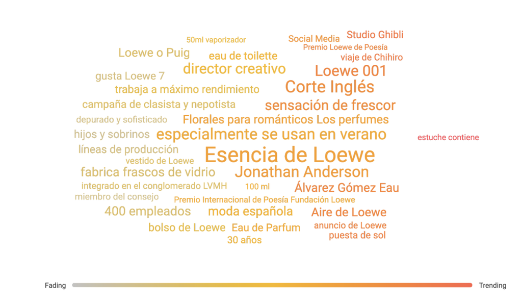 En el gráfico de temas en tendencia que observamos antes cabe destacar la perfumería como una clave en la conversación sobre Loewe: “florales para románticos”, “esencia Loewe”, “Loewe 001, “eau the parfum” o “aire de Loewe” son expresiones que están protagonizando la charla online de la marca últimamente.