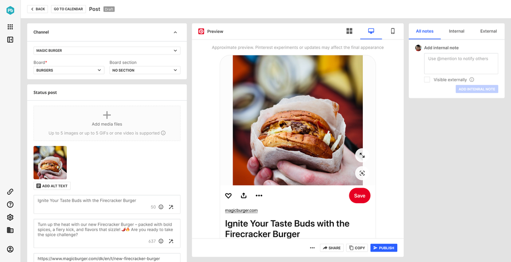 Usa la herramienta de programación de Pinterest para programar tus publicaciones con hasta 30 días de antelación. También existen herramientas de programación avanzadas, como Brandwatch, que ofrecen funciones adicionales para facilitar el trabajo de los responsables de redes sociales. ¡A continuación te contamos más!