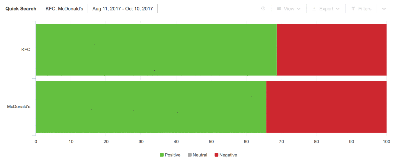 Pero, al usar Quick Search, podemos entender este sentimiento de verdad (hemos excluido las menciones neutrales). ¿Quién es más popular cuando se habla de patatas, hamburguesas o pollo?