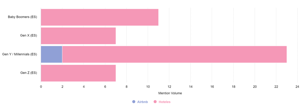 Las menciones que encontramos en este ejercicio muestran que la conversación en torno a Airbnb (el 2%) es mucho menor a aquella que menciona hoteles tradicionales (98%).Y de hecho, solo los millennials hablan de la aplicación para hospedarse.