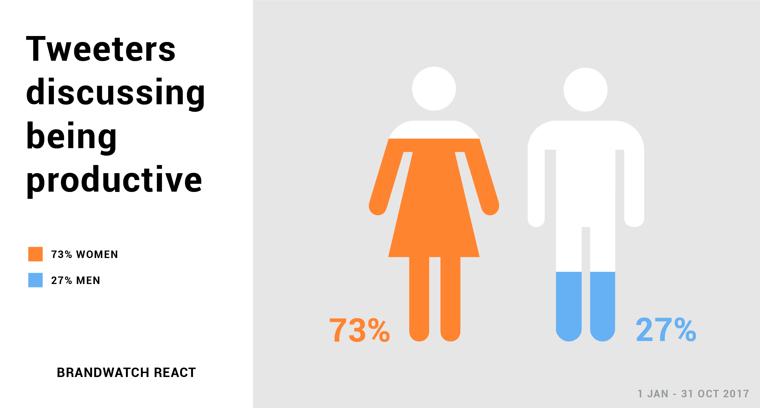 Las mujeres tuitean más que los hombres sobre ser productivas (y con diferencia). ¿Significa esto que las mujeres son más productivas que los hombres? Probablemente no, solo es que ellas suelen ser más elocuentes. Tal vez las mujeres hablan de ser productivas porque aún existe la diferencia salarial entre géneros.