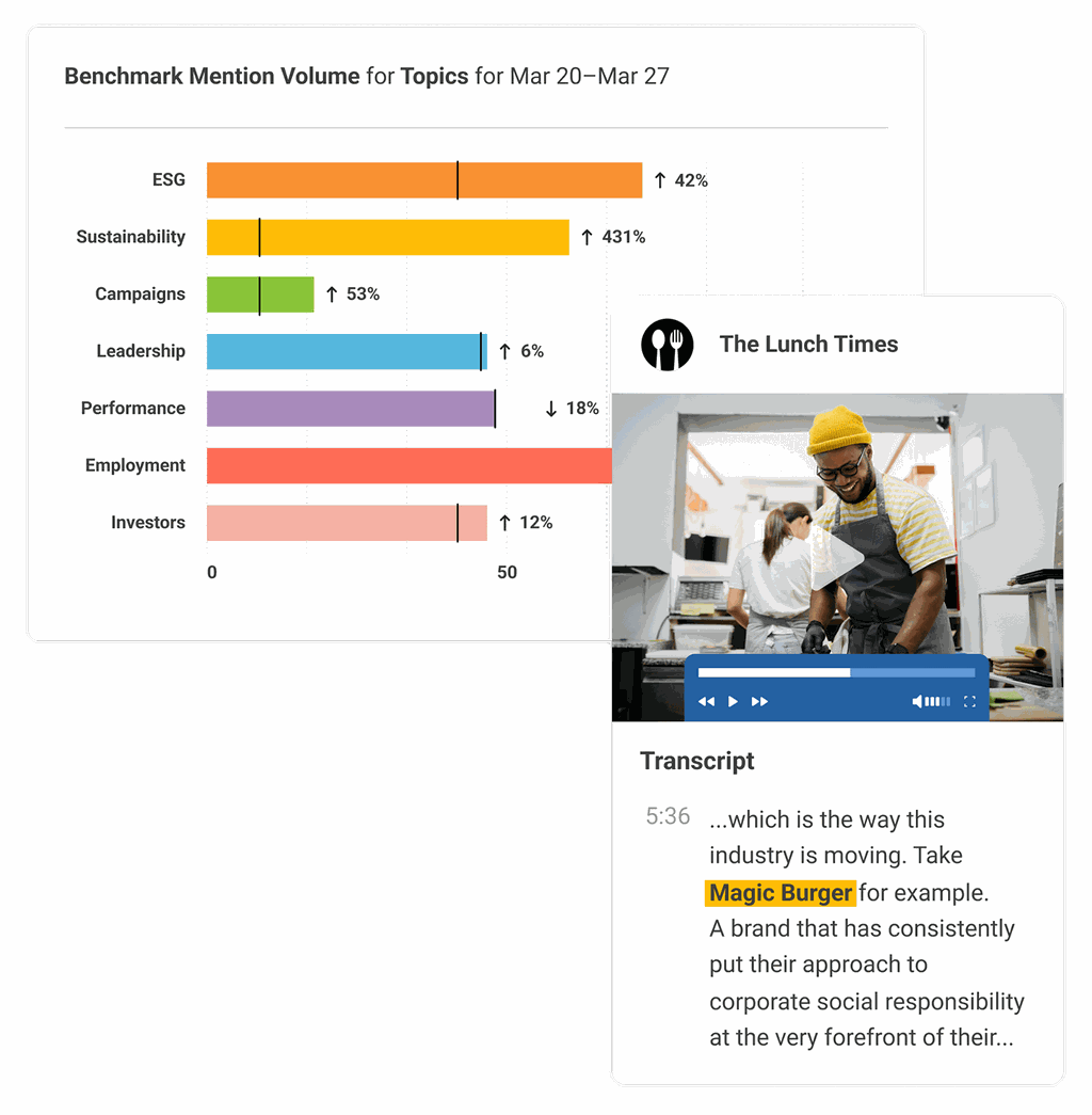 Analiza transcripciones de voz a texto donde se ha mencionado tu marca, productos, personas relevantes o temas de la industria utilizando todas las capacidades de análisis de texto impulsadas por la IA de Brandwatch. Desarrolla, por tanto, una comprensión más profunda gracias a la cobertura de medios.