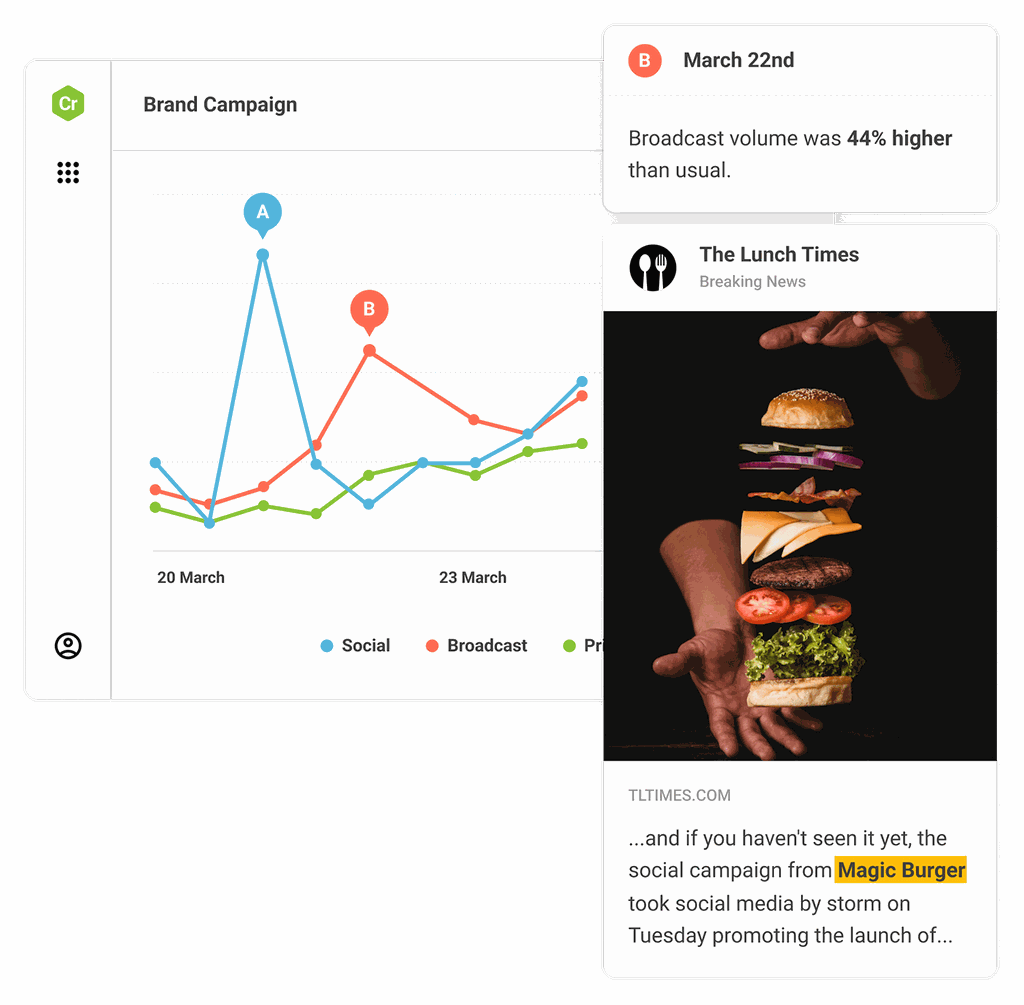 Captura las menciones de tu marca en televisión y radio, en tiempo real, junto con tus menciones en redes sociales, datos de impresión, noticias online y más. Todo desde una misma plataforma.