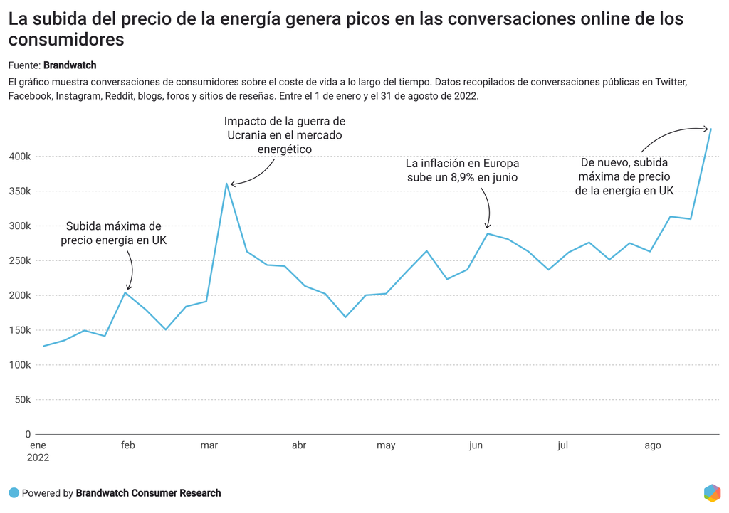 Los dos picos que destacan en la conversación online de los consumidores analizada giran en torno al aumento de los precios de la energía y su impacto en los consumidores.
