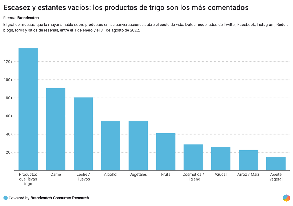 En cuanto a las compras, los consumidores hablan online sobre cómo quieren cambiar su comportamiento de compra. Las compras por pánico o el aprovisionamiento han obtenido el mayor volumen de menciones entre el 1 de enero y el 31 de agosto del 2022.