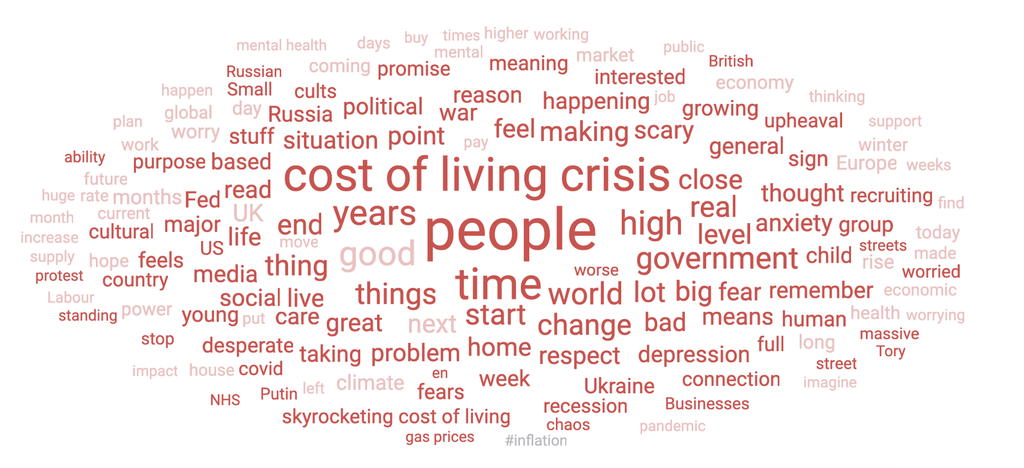 Con millones de personas influenciadas negativamente por el aumento del coste de vida, la inflación y la subida vertiginosa de los precios de la energía, no es de extrañar que las conversaciones online sean casi puramente negativas.