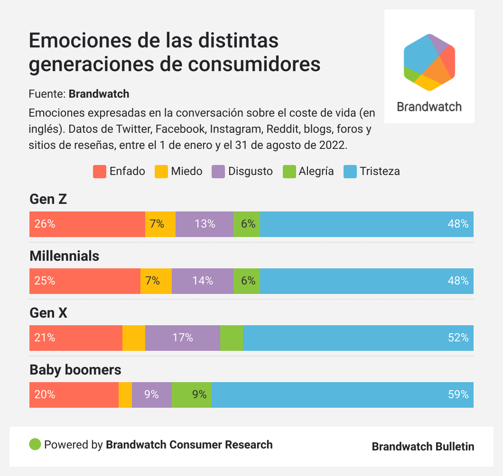 En general, las conversaciones en todos los grupos de edad son principalmente negativas. Los baby boomers son más proclives que otras generaciones a expresar tristeza en sus conversaciones. Las generaciones más jóvenes, la generación Z y los millennials son más propensas a expresar emociones de enfado y miedo cuando hablan del aumento del coste de vida.