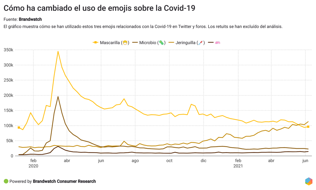 Hemos descubierto que los emoticonos relacionados con la pandemia cuentan una historia optimista de recuperación porque se utiliza más el emoji de la jeringuilla o vacuna que el de la mascarilla o el microbio.