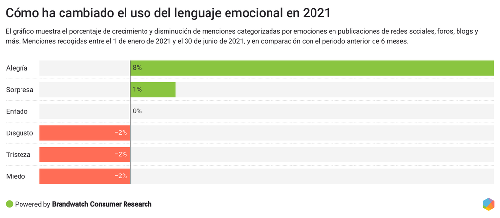 El siguiente gráfico compara cómo ha cambiado el lenguaje emocional durante estos seis meses de 2021 con respecto a los seis anteriores.