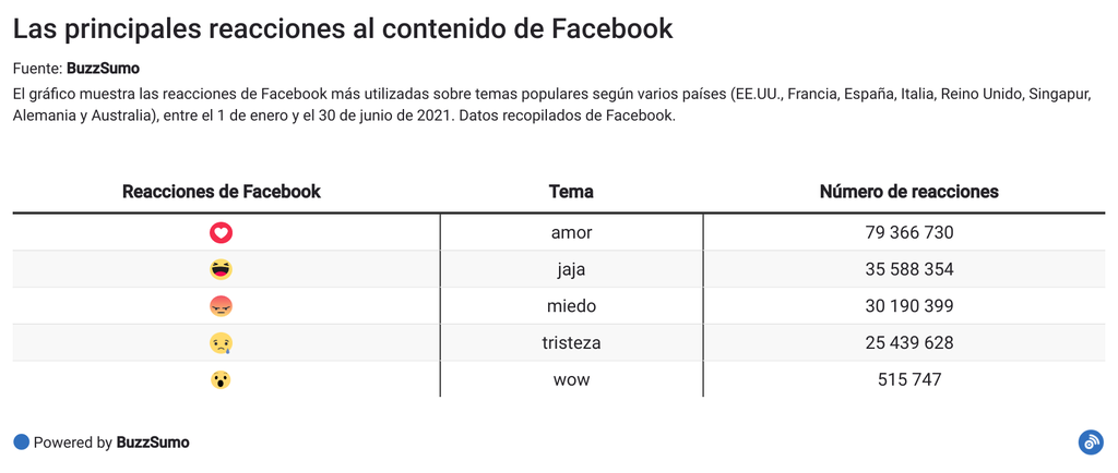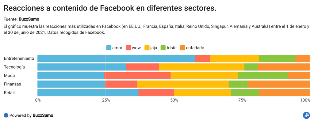 En este informe, utilizamos BuzzSumo para analizar las reacciones de Facebook: me encanta, me divierte, me enfada, me asombra y me entristece.