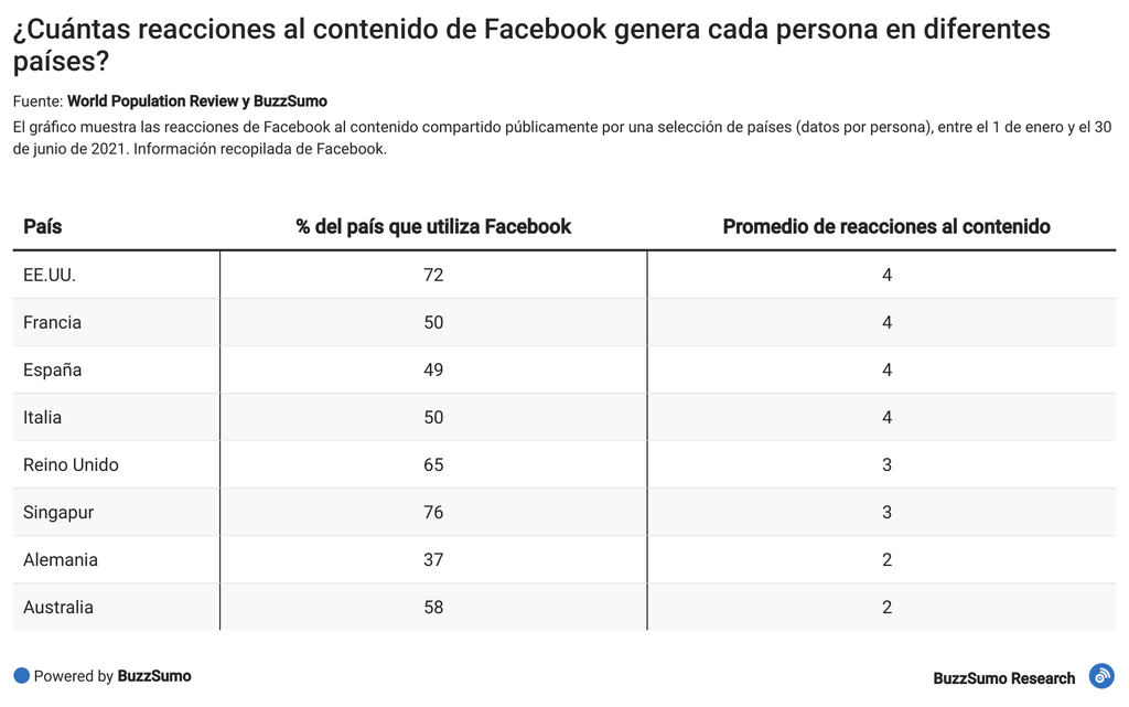 - Estados Unidos también sobrepasaba el uso de Facebook de cada una de las naciones estudiadas, con una media de al menos una reacción por persona en Facebook.