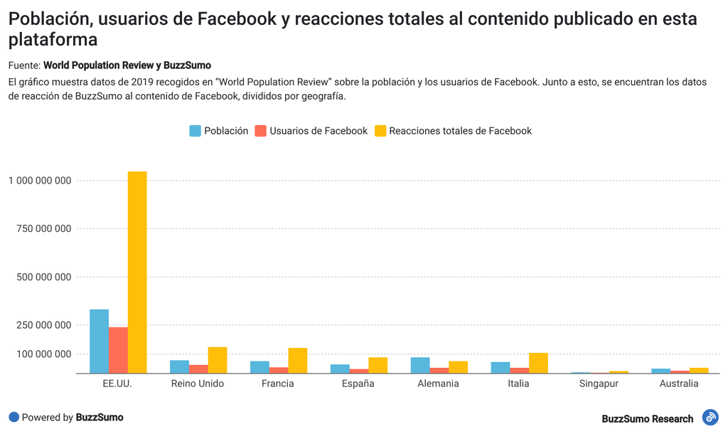 - Estados Unidos sí que es el país más poblado y el que más utiliza Facebook en comparación con el resto de países estudiados, lo que explica la cantidad de reacciones.