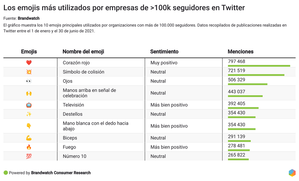❤️ (Corazón rojo): con 822 millones de menciones, ha sido el emoticono más utilizado por marcas y organizaciones en lo que llevamos de año. Siguiéndole de muy cerca están 💥 (explosión) y 👀 (ojos).
