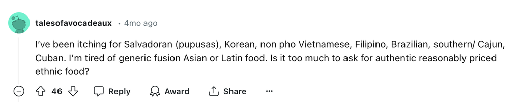 Los consumidores comparten sus experiencias positivas al degustar comida con sabores nuevos e interesantes y comer platos "especiales" que no suelen ver en otros restaurantes.