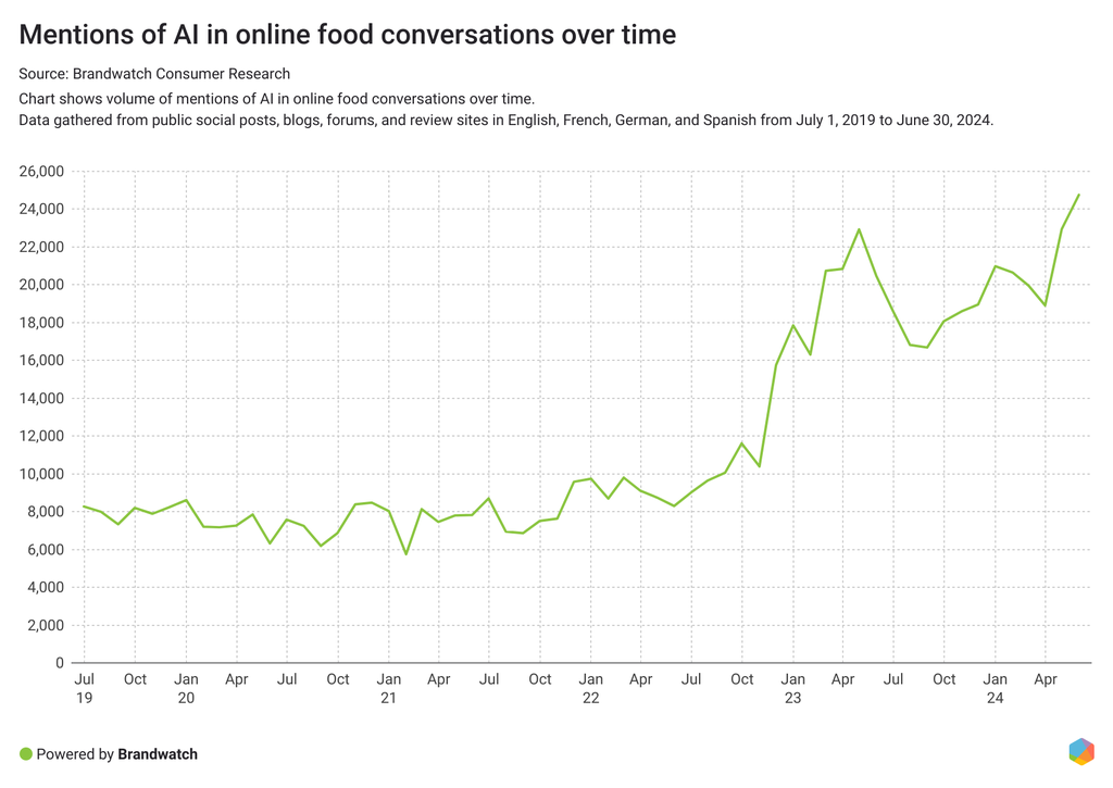 Las menciones a la IA en conversaciones online sobre alimentos y bebidas aumentaron un 30 % entre el 1 de julio de 2023 y el 30 de junio de 2024 en comparación con los 12 meses anteriores.
