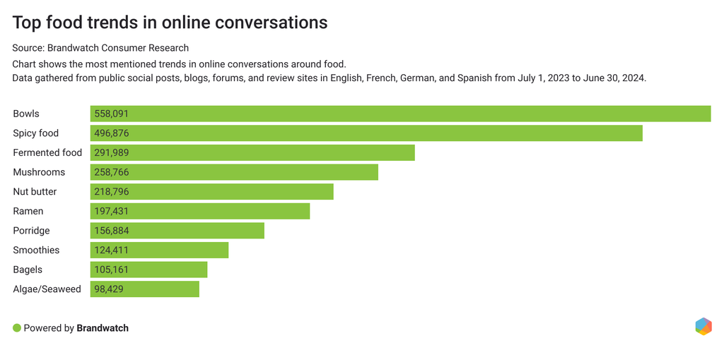 Los bowls son la tendencia alimentaria número uno en 2024, y ya llevan unos años siéndolo. A la gente le encantan los bowls, y el número de autores únicos que hablan de ellos en Internet creció un 3 % del 1 de julio de 2023 al 30 de junio de 2024 en comparación con los 12 meses anteriores.