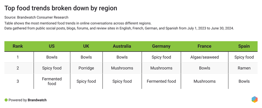Mientras que los bowls son la tendencia alimentaria más popular en las conversaciones online entre los consumidores de EE. UU., Reino Unido y Australia, los consumidores de Alemania y España suelen hablar más de comida picante.