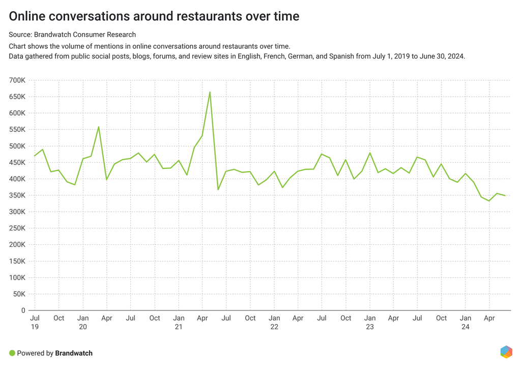 Las conversaciones online sobre restaurantes están en declive. Los consumidores hablan menos de sus experiencias en restaurantes, con un descenso del 9% en las menciones del 1 de julio de 2023 al 30 de junio de 2024 en comparación con los 12 meses anteriores.