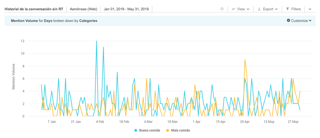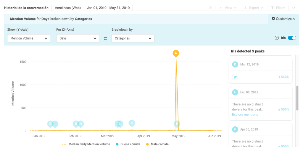 Como ejemplo, utilizaremos la conversación que recogimos sobre la buena y la mala comida que se sirve en los vuelos. Nuestro sistema de análisis Iris, que funciona con inteligencia artificial, ayudó a localizar el motivo de este gran pico que encontramos en mayo en la conversación.