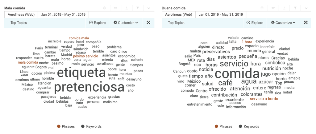 Las nubes de palabras es otra función de Brandwatch que nos ayuda a descubrir cuáles son los temas más frecuentes dentro de un conjunto de conversaciones. Siguiendo con el ejemplo de la buena y mala comida servida en los vuelos, si creamos nubes de palabras de esas conversaciones, podremos conocer las preferencias de los consumidores.