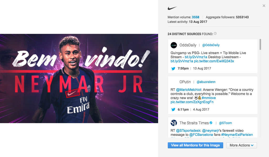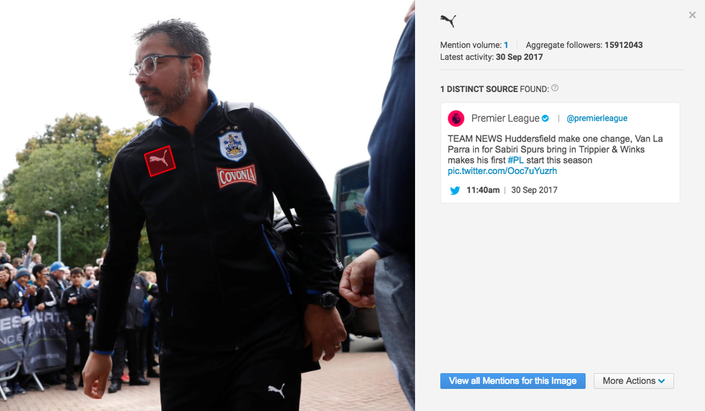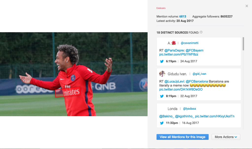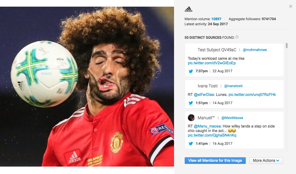 Detección de logotipos: Brandwatch emplea un motor de aprendizaje adaptativo para descubrir los logotipos dentro de una imagen. La tecnología busca un sinfín de atributos para encontrar todo tipo de logotipos, incluyendo detecciones curvadas, borrosas, pequeñas y parcialmente cubiertas.