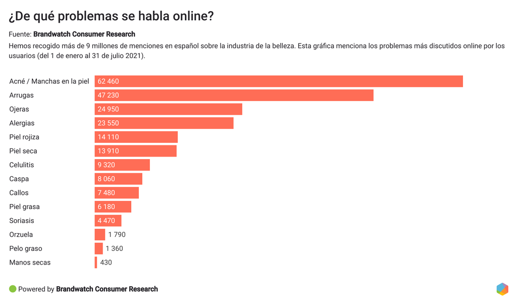 Hemos analizado conversaciones en línea sobre productos de belleza y tendencias. En concreto, se han recogido más de 9.78 millones de menciones sobre la industria de la belleza en español, utilizando Brandwatch Consumer Research (del 1 de enero al 31 de julio de 2021).