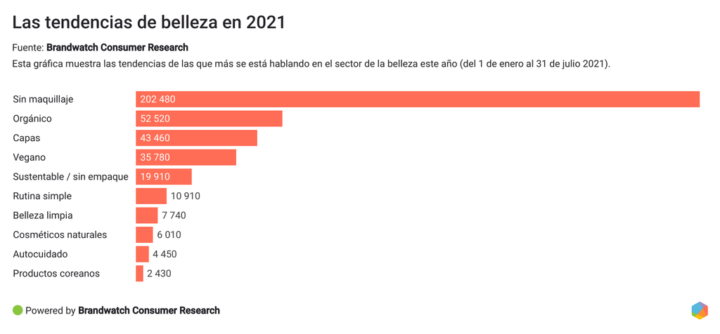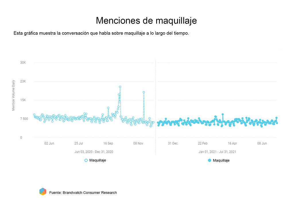 Se espera que esta tendencia continúe a la baja el resto de 2021.Y así como el uso de maquillaje parece haber disminuido debido a este nuevo contexto social, la tendencia “sin maquillaje” es la que surge con más fuerza entre las conversaciones de los consumidores digitales.