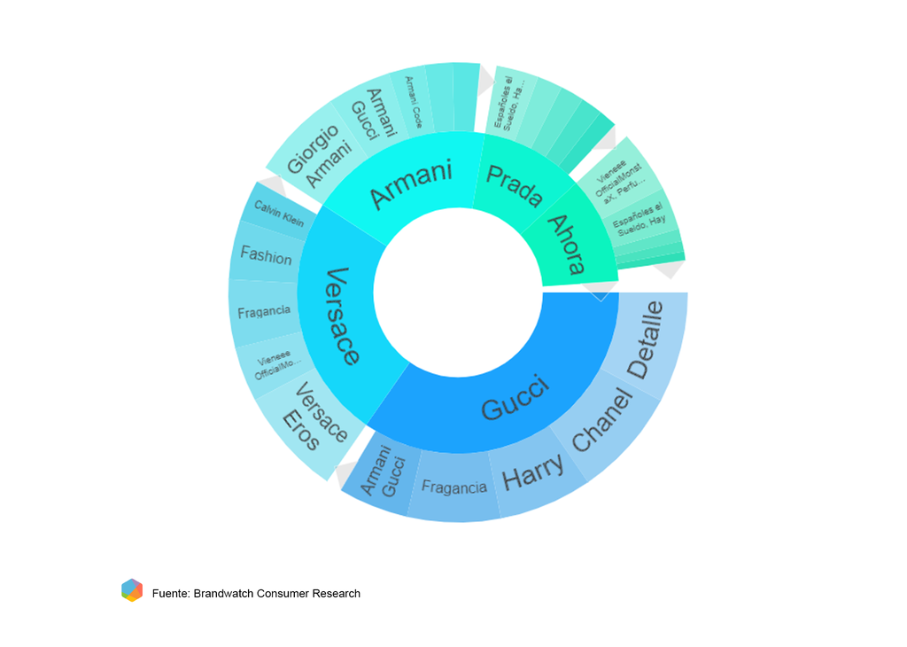 En este caso, las principales palabras que se mencionan junto a las marcas son: otras marcas del sector, fashion, fragancia y regalos.