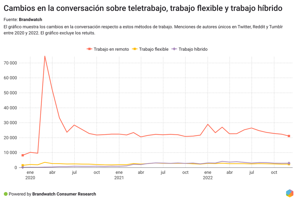 La conversación sobre el teletrabajo también ha descendido ligeramente en cuanto a menciones hacia finales de 2022, probablemente porque el trabajo a distancia se está convirtiendo en una parte normal de la vida de muchas personas.