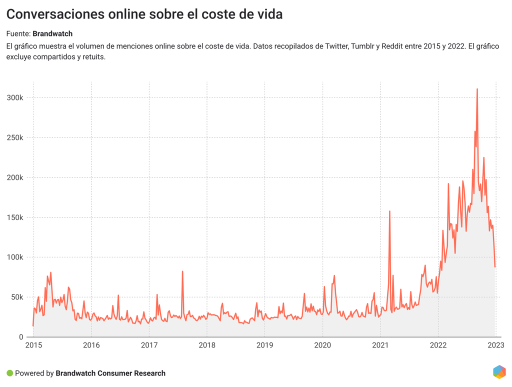 Y según Brandwatch Consumer Research, se ha producido un aumento del 97% en las conversaciones sobre el coste de vida en comparación con el año anterior.