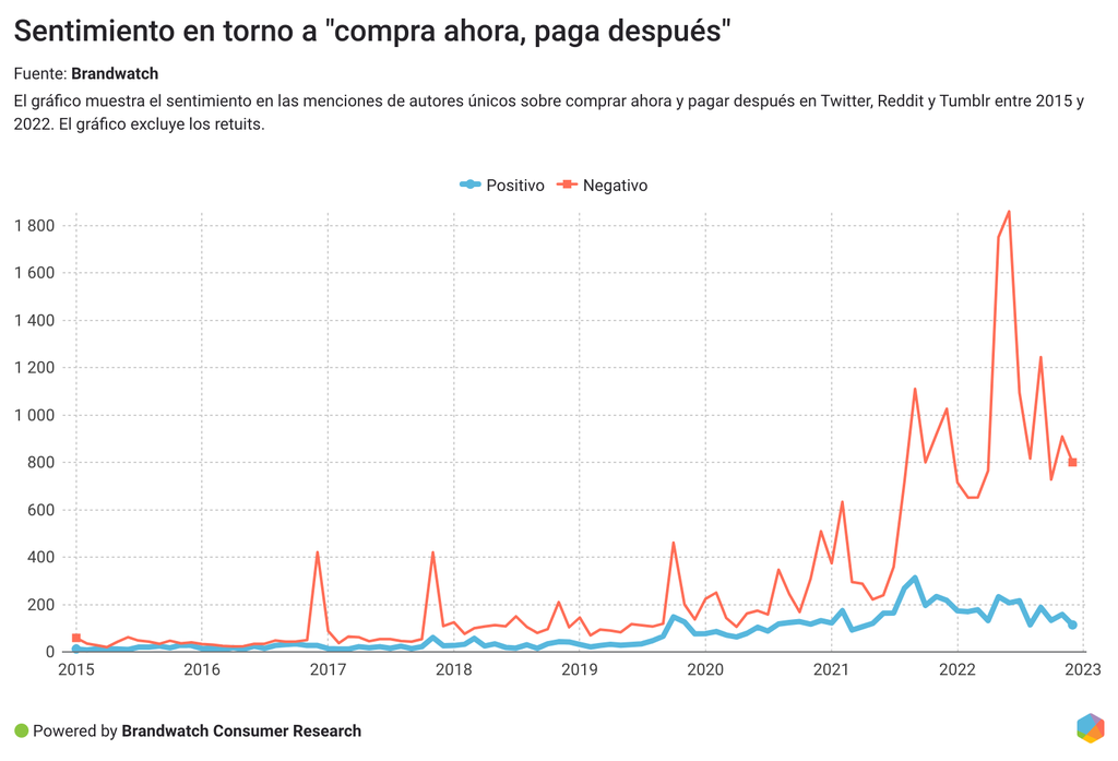 El crecimiento de la popularidad de CAPD ha provocado una oleada de sentimientos negativos en las conversaciones online. En junio de 2022, el sentimiento negativo hacia las opciones de "compra ahora, paga después" estaba al máximo.