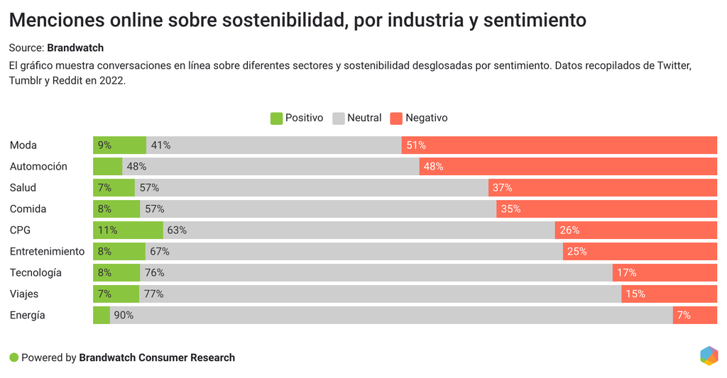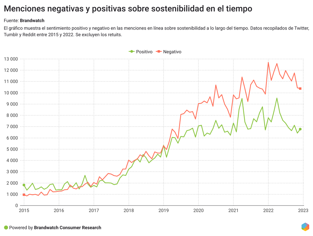 En las conversaciones positivas, los consumidores elogian proyectos e iniciativas que les gustan de marcas que logran cambios. Los que mencionan la sostenibilidad y el futuro de forma negativa están preocupados por cómo estará el clima en unos años.
