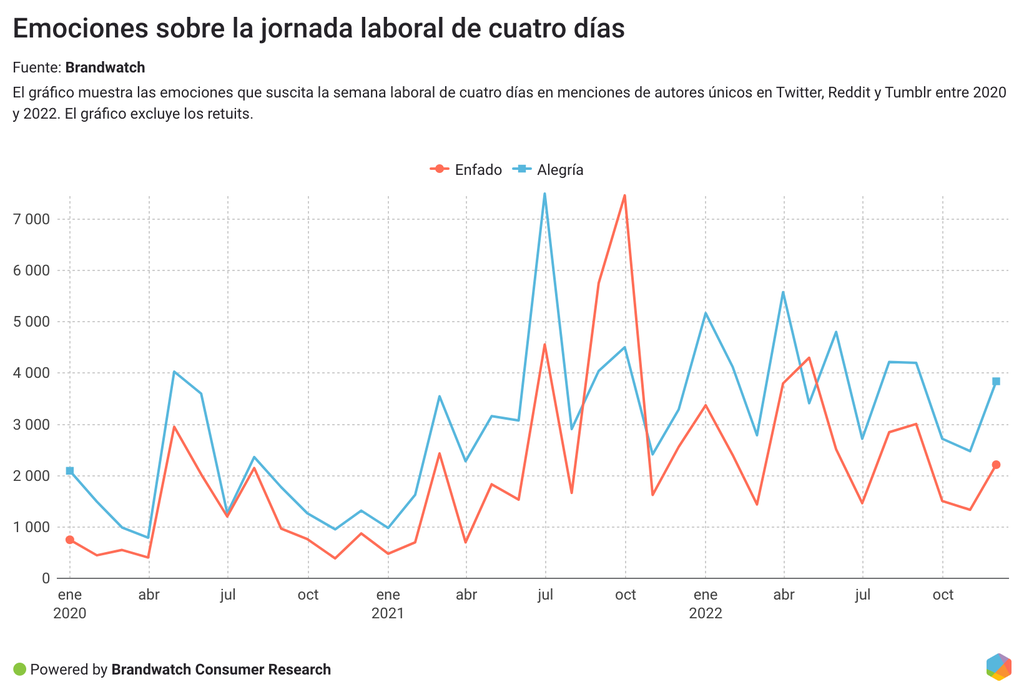 El gráfico anterior muestra las menciones de enfado y alegría sobre esta semana laboral en las conversaciones online desde 2020.