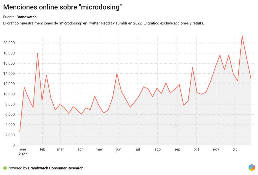 Las menciones online sobre la microdosificación han experimentado un aumento constante a lo largo de 2022, con un pico notable hacia finales de año.