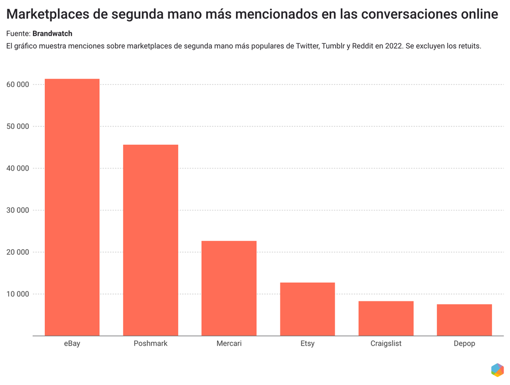 ¿Dónde prefieren los consumidores comprar o vender de segunda mano? Al desglosar las conversaciones online en inglés por plataformas de segunda mano populares, vemos que eBay, Poshmark y Mercari son las principales.