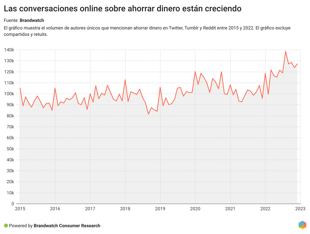 Para contrarrestar la inflación, buscan formas de ahorrar dinero. Las conversaciones online han registrado un aumento del 12% en quienes hablaban de ahorrar dinero en 2022 en comparación con 2021. Y las conversaciones no parecen estar disminuyendo.