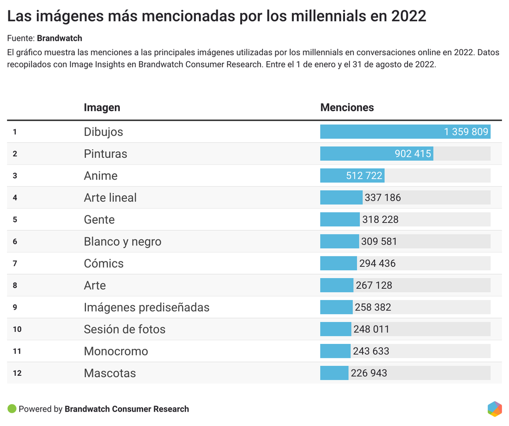 Curiosamente, la generación Z responde mejor a las ilustraciones. Esta prefiere los contenidos animados en las redes sociales, desde dibujos animados, que han aparecido en casi 4 millones de menciones, hasta dibujos y anime.