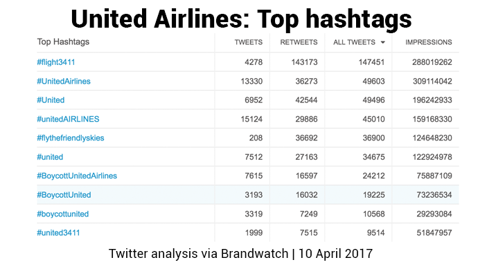 Le 26 mars, alors que le « LeggingsGate » faisait la une de la presse, nous avons mesuré près de 135 000 mentions de la marque en un seul jour à travers Facebook, Twitter et Instagram. Le 10 avril, alors que les vidéos du passager se faisant trainer de force circulaient sur Internet, nous avons enregistré plus de 1,5 millions mentions de la compagnie aérienne américaine.