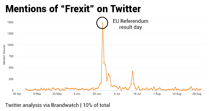Nous nous sommes demandé si le résultat du Brexit impactait l’opinion publique sur la potentielle sortie d’autres pays de l’Union Européenne et nous avons observé que le « Frexit » a connu un pic de mentions le jour où les résultats du Brexit ont été annoncés.