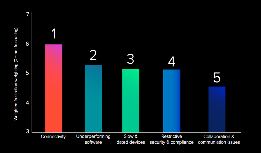 Les travailleurs sont ultra mobiles, et la dépendance aux réseaux haute performance n’a jamais été aussi grande. Les recherches menées à NetMotion révèlent néanmoins que l’expérience utilisateur d’une personne qui travaille sur un portable ou se trouve connectée à un réseau mobile est souvent un peu… euh, mauvaise. Pour 41 % des répondants – ça fait beaucoup de monde – les problèmes de connexion sont les principaux responsables du mécontentement qu’ils éprouvent à l’égard de leur lieu de travail. Les réseaux ont du retard à rattraper.