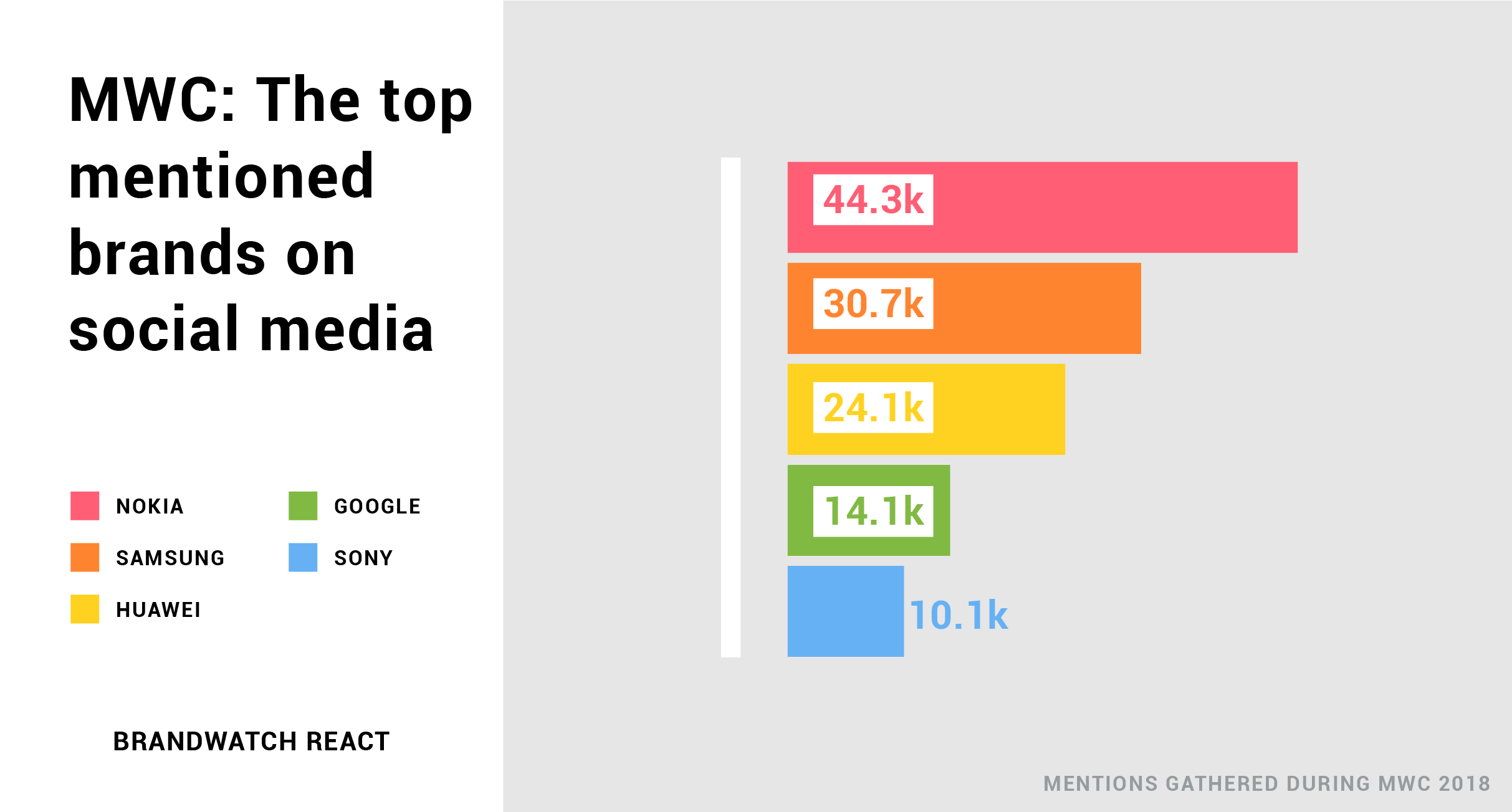 Nokia est en tête du classement suivi de Samsung, Huawei et Google pour être la marque la plus mentionnée dans la conversation MWC 2018. Bien que nous ayons utilisé une méthodologie légèrement différente l’année dernière, la marque a également triomphé en 2017.
