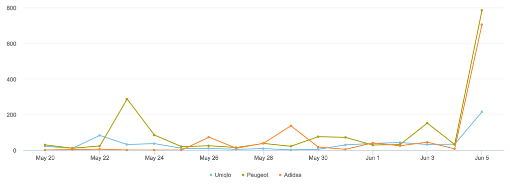 En regardant la volumétrie d’activité sociale, on voit qu’Adidas a su optimiser sa position de fournisseur officiel en communiquant de manière régulière tout au long du tournoi.